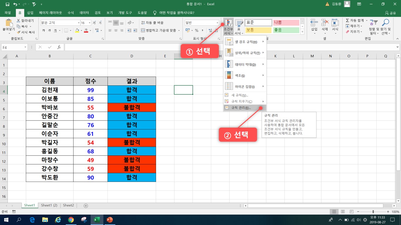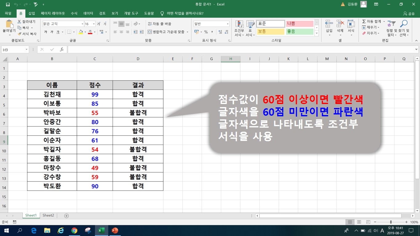 2.“불합격”이 입력되어 있는 셀을 빨간색 명암을 적용해보자.