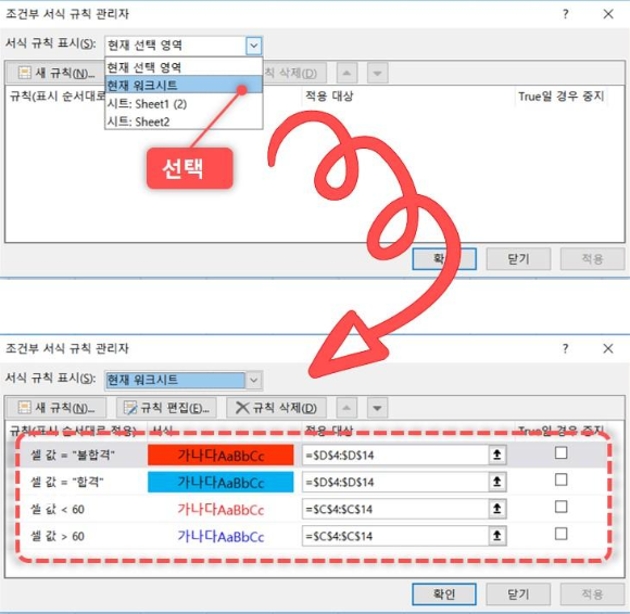 위 그림에서 보듯이 [조건부 서식 규칙 관리자]창에서 [서식 규칙 표시]를 “현재 워크시트"를 선택하면 아래 창과 같이 내가 작업하고 있는 엑셀 워크시트에 적용되어 있는 조건부 서식의 조건값과 서식표시, 적용범위를 나타낸다. 해당창에서는 새로운 규칙을 만들 수도 있고 수정, 삭제 기능까지 포함되어 있다.