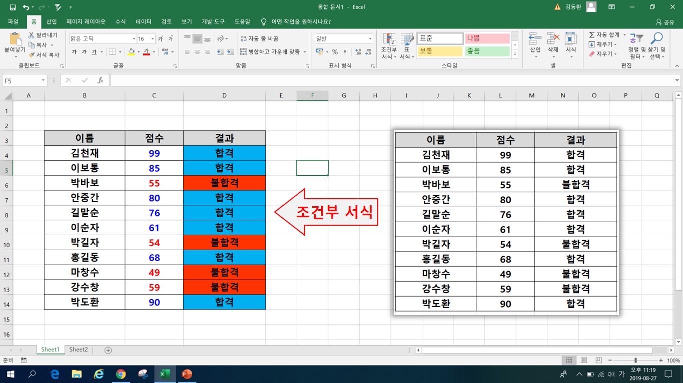 글자색을 바꿔서 눈에 띄게 하는 서식보다는 셀의 바탕색 즉, 명암을 바꿔주면 보다 직관적인 서식이 될 듯하다. 그럼, 이런 방법을 통해서 합격, 불합격에 조건부 서식을 적용하여 보자.